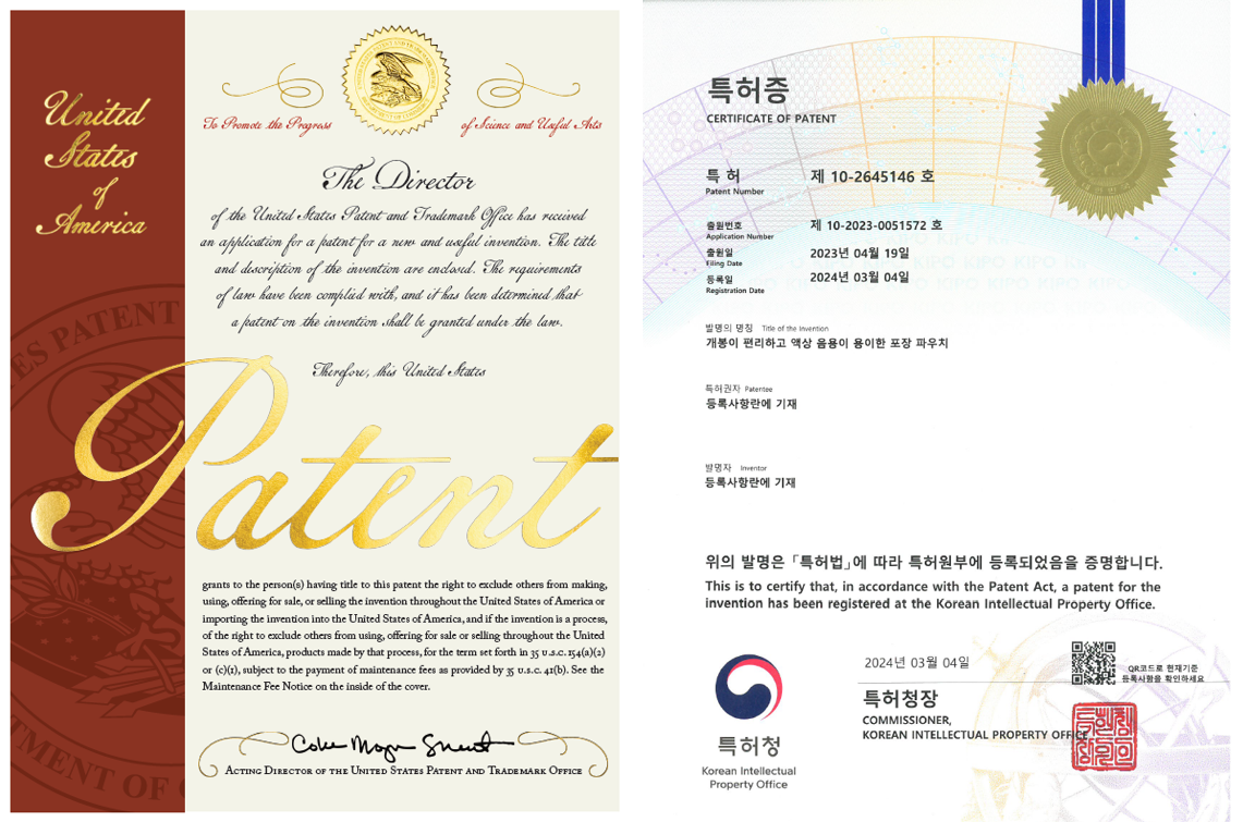 경희대학교 공병만 교수가 개발한 이중제형 포장파우치가 2025년 8월 19일 미국 특허청(USPTO)에 등록됐다.